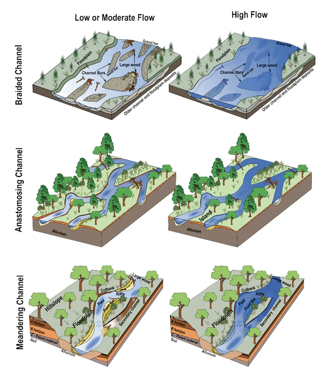 Low- and high-flow stages in braided, anastomosing, and meandering channels. The high-flow stage encompasses the active channel in each of these systems.” Sourced with permission from National Ordinary High Water Mark Field Delineation Manual for Rivers and Streams : Interim Version.