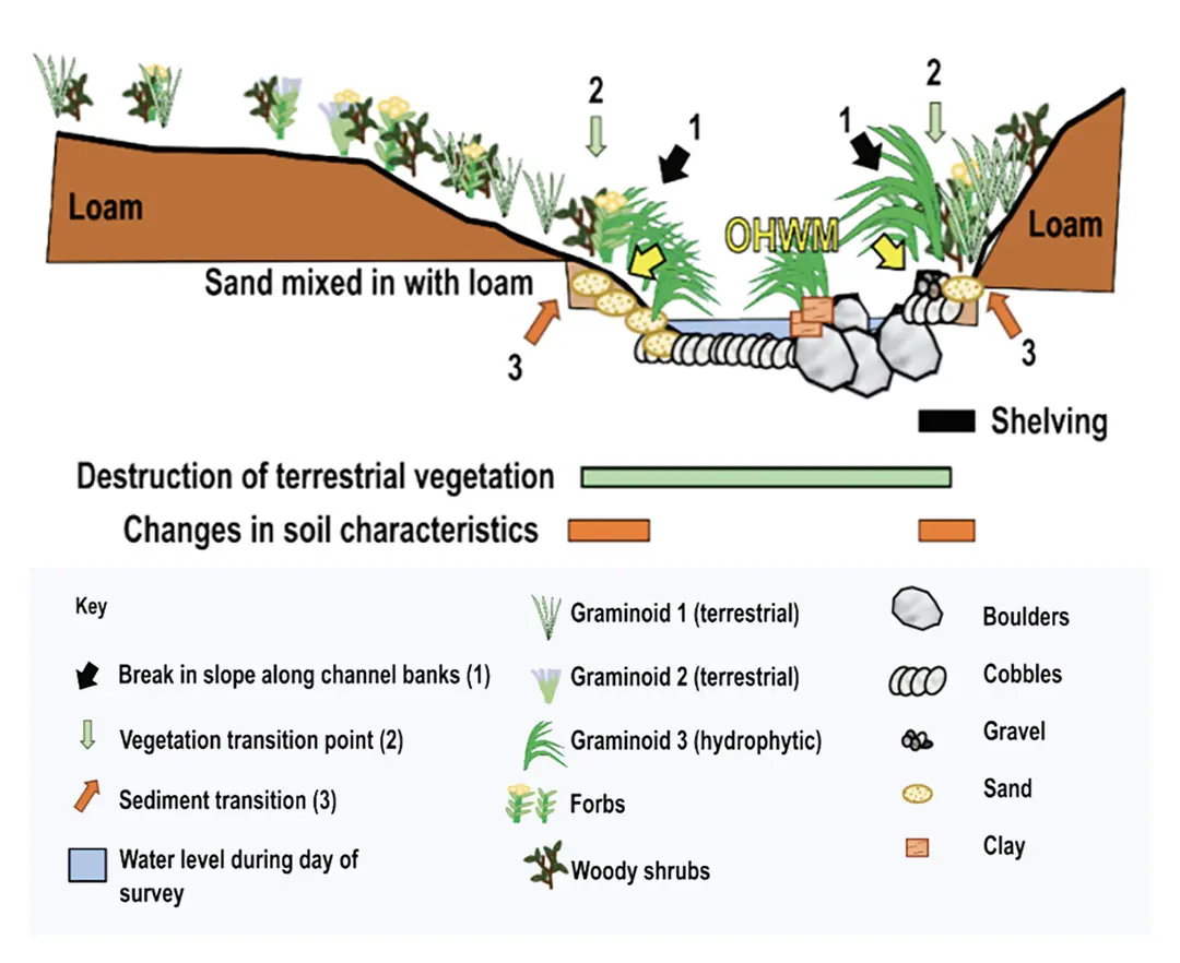 Cross section of a stream showing the identification of the OHWM. The OHWM is determined by weighing the body of evidence of four different kinds of indicators: geomorphic, vegetation, sediment, and ancillary. In this example, the physical changes labeled are (1) location of the break in slope and shelving, (2) vegetation, and (3) sediment. Sourced with permission from National Ordinary High Water Mark Field Delineation Manual for Rivers and Streams : Interim Version.