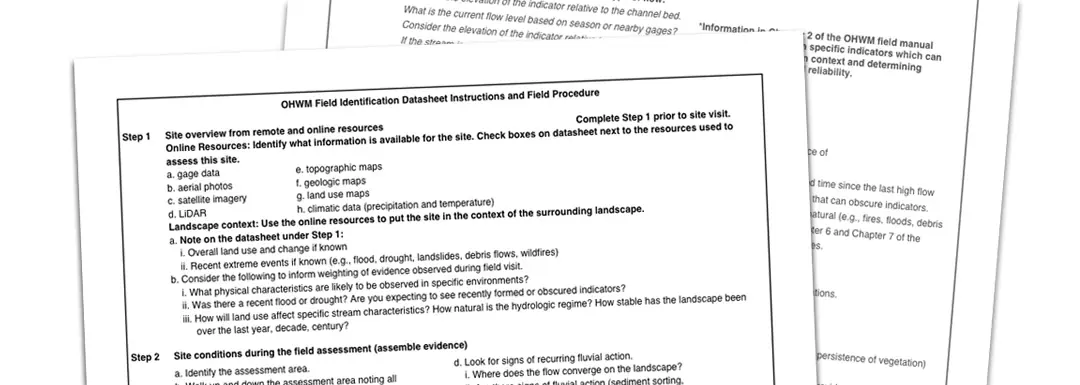 The U.S. Army Corps of Engineers’ jurisdiction over streams is limited to the area of water flow. The Corps published the Rapid Ordinary High Water Mark (OHWM) Field Identification Data Sheet to support the determination of jurisdictional boundaries. This process provides guidance for identifying stream boundaries by integrating scientific principles with a weight-of-evidence approach. The form’s step-by-step instructions make it a practical and accessible methodology for environmental scientists.